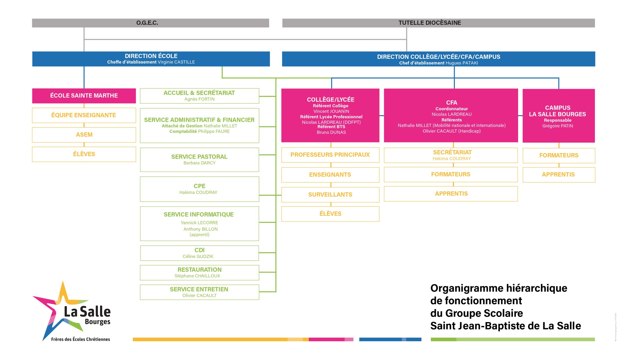 Aujourd’hui la direction, animée par Virginie Castille et Hugue PATAKI, chef d’établissement, ainsi que toute l’équipe, poursuivent dans l’esprit issu de l’héritage de Saint Jean-Baptiste de La Salle.